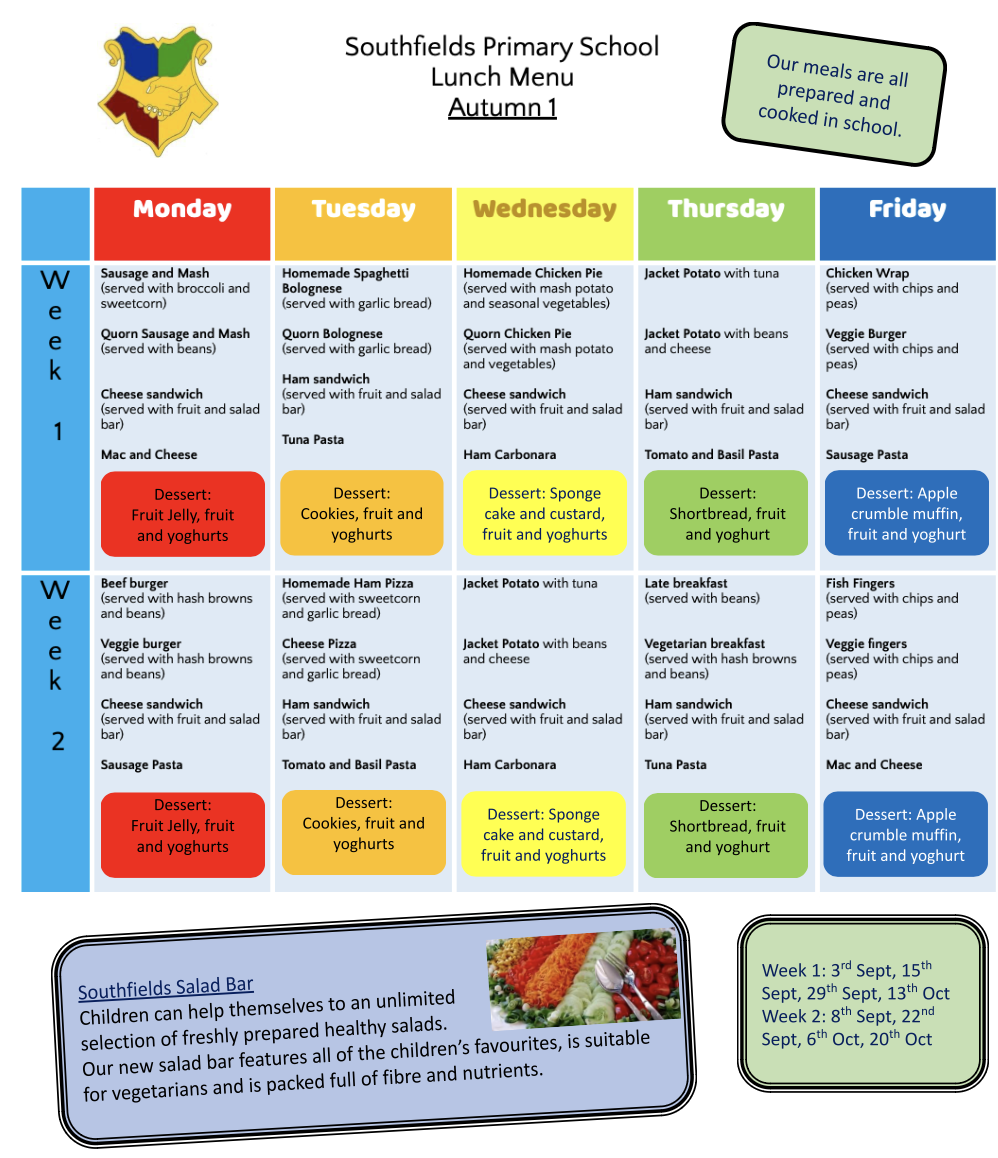 Welcome to our School Dinners page! At Southfields Primary School, we provide healthy, balanced meals every day to support your child’s learning and wellbeing. We are proud of our catering at Southfields. We own and manage our own kitchens and have a full-time Kitchen Manager, Mrs Dehinbo, and three assistants who work incredibly hard to cook fresh meals on site. We are a healthy school but also like to take time to find out what the children like to eat as well as broaden their experience of food.